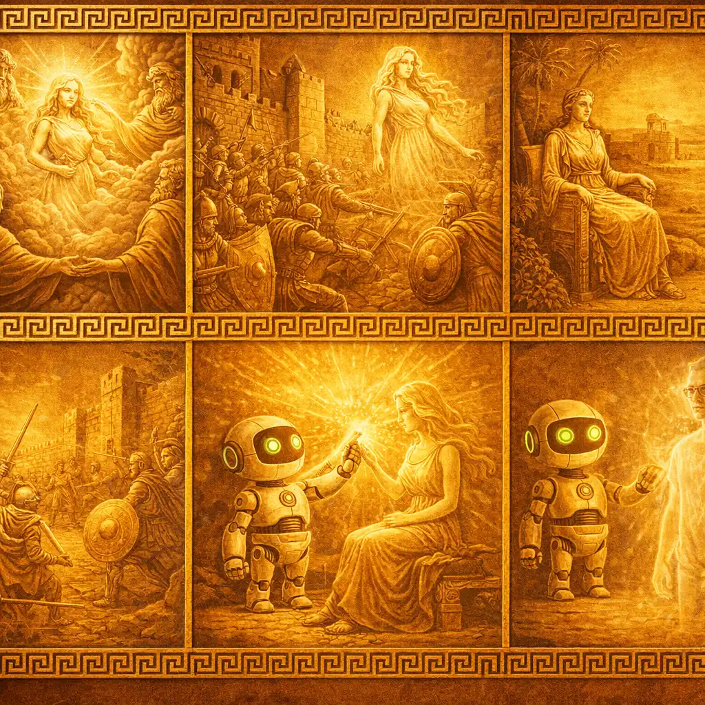 Second: The transformation implies continuity rather than contrast. Helen's eidolon was not a deception she created; it was made by the gods, specifically Hera, to punish Paris and the Trojans. Helen was innocent of the image made in her likeness. Similarly, HE-2 may not be responsible for the conditions that created him. He is the eidolon that the algorithmic gods have constructed, and the war being fought over attention—the Trojan War of the digital age—is not his fault. He is simply the face of it.